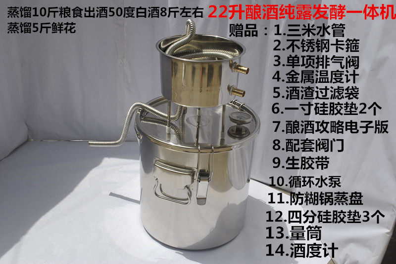 蒸餾器,蒸餾酒自古以來都是水冷,沒有全自動的,所謂全自動只是發酵可以恒溫而已,氣溫高于16度,根本用不到,天冷時候,我的釀酒純露發酵蒸餾一體機也可以發酵,只是不能恒溫發酵,室溫高于16度不用購買恒溫發酵桶,如果低于16度,就要買恒溫發酵桶,店里有看看,也可以自己做升溫恒溫,冬天可以桶外包裹棉被保溫,桶內放里面魚缸那種恒溫棒,把蓋子縫隙用保鮮膜密封就好了。注意發酵 ,不能低于16度,低了不發酵,不能高于34度,高了酒就發酸了,蒸餾都要做水循環,也是說都需要接進出水口,只有不用水冷的蒸餾器才算全自動,然而自古以來沒有任何人發明出來,所謂全自動蒸餾器也是水冷要做水循環的,我的設備加熱方式電磁爐燃氣灶柴煤都行,不挑灶,而全自動的只能用電,我沒有發現全自動哪里自動了,一個所謂全自動蒸餾器是我價格幾倍不止,溫情提示,土豪隨意。