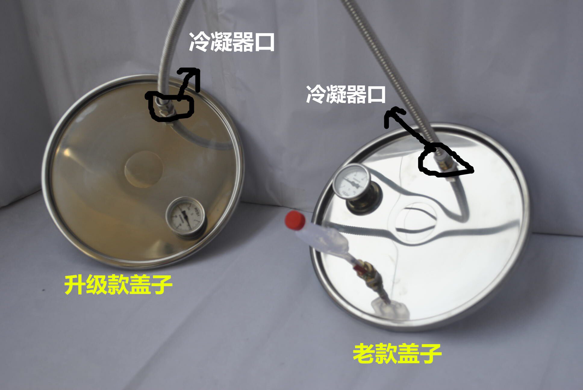 即日起,設備蓋子都改成升級版蓋子,用冷凝器時候用不到排氣閥,排氣閥是做發酵桶時候才能用到,升級款少打一個口,密封更好,老款蒸餾時候是關閉排氣閥,蒸餾時候沒有任何作用,還有漏氣的風險,做發酵桶時候,老款也要去掉冷凝器,然後把排氣閥孔打開,在堵住冷凝器口,升級款做發酵桶使用,只需要把排氣閥直接安裝到冷凝器口即可,功能沒有任何損失,設備設計更完美。